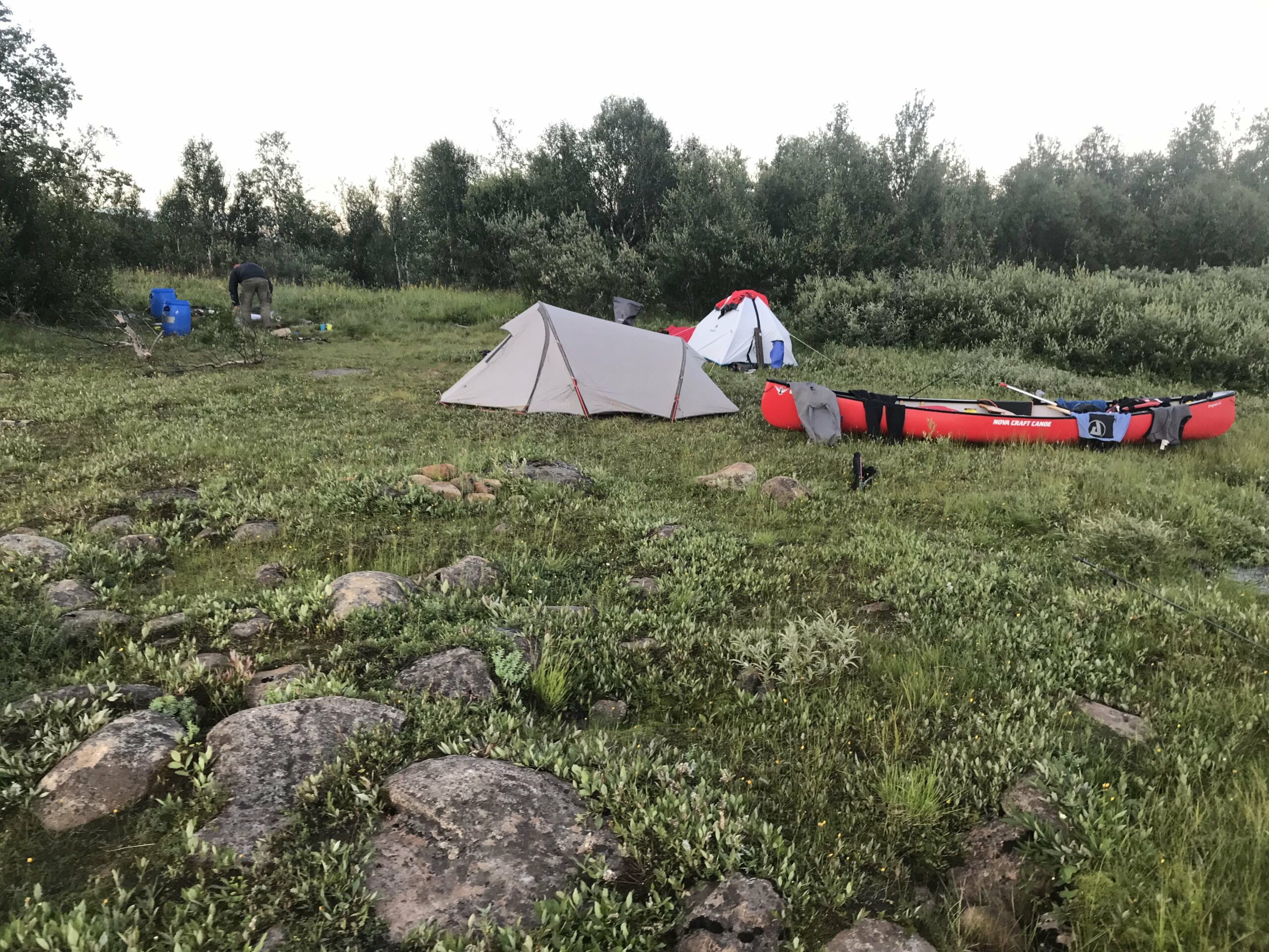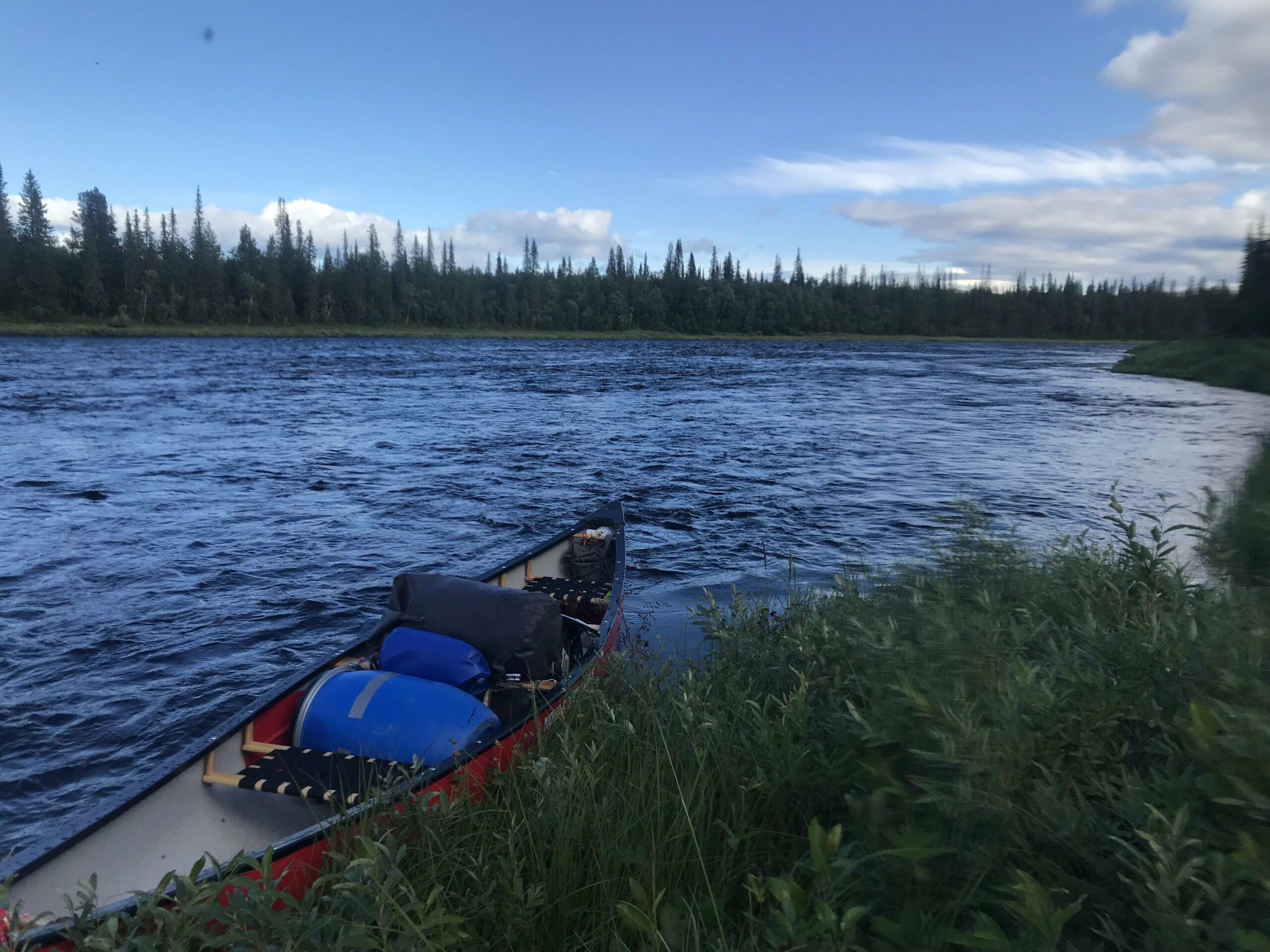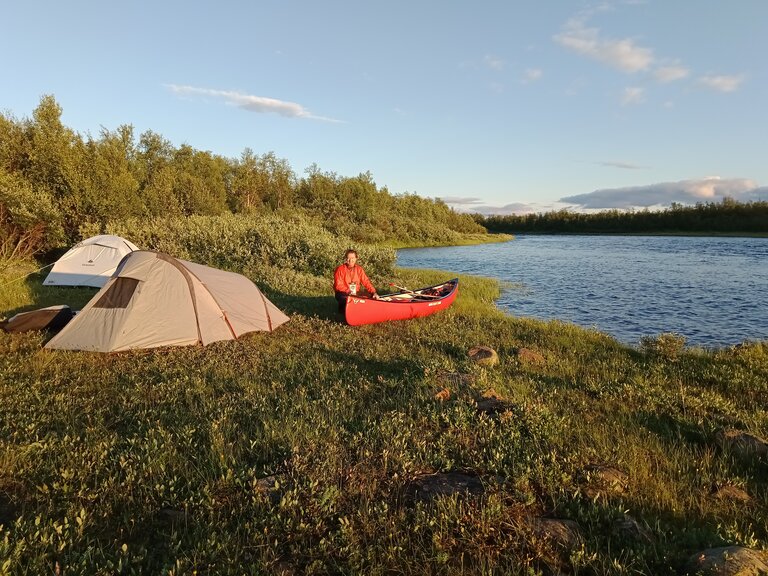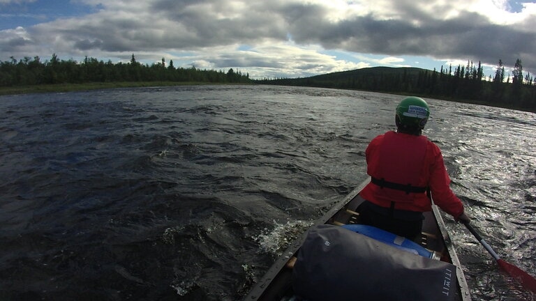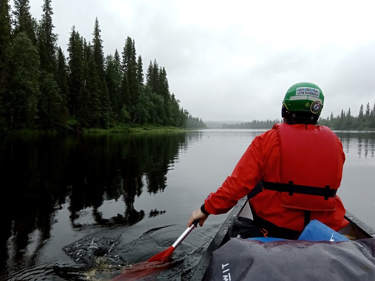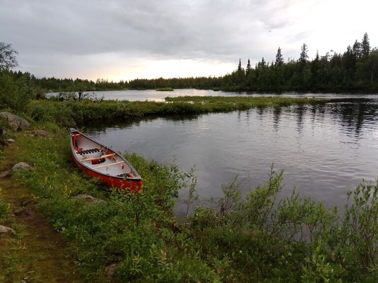 La seule question qui vaille quand nous arrivons en Laponie « est-ce qu’il y a des moustiques cette année ? » reçut une réponse concise mais claire : « c’est une année assez extrême ». La météo annoncée était exécrable (elle le fut en bonne partie). Le niveau d’eau était haut pour la saison. Pour couronner le tout, nous n’avions dégotté sur place qu’un canoë de 16 pieds de long, un peu court pour nos deux gabarits et le chargement conséquent d’une expédition en autonomie, en milieu isolé, par temps froid et à seulement un bateau… La chose requerrait pas mal de finesse. Il allait falloir prendre nos marques.