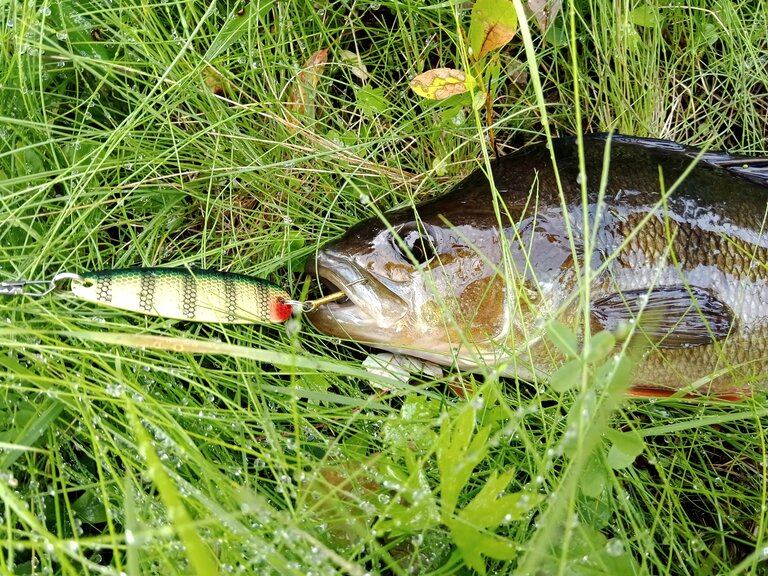 Nous fumes secs le reste de la descente quoique la pluie se mêla de l’histoire. La pêche nous permit de voir les jolis poissons de la région, ombre arctique, truite fario, perche commune et brochet. Une (sur)prise : l’ide, un poisson de la famille de la carpe introduit dans ces eaux. Fort heureusement, nous ne prîmes pas un des individus rouges que compte cette espèce et qui sont communément vendus dans les jardineries pour peupler les marres boueuses. Notre amour propre ne l’aurait pas supporté.
