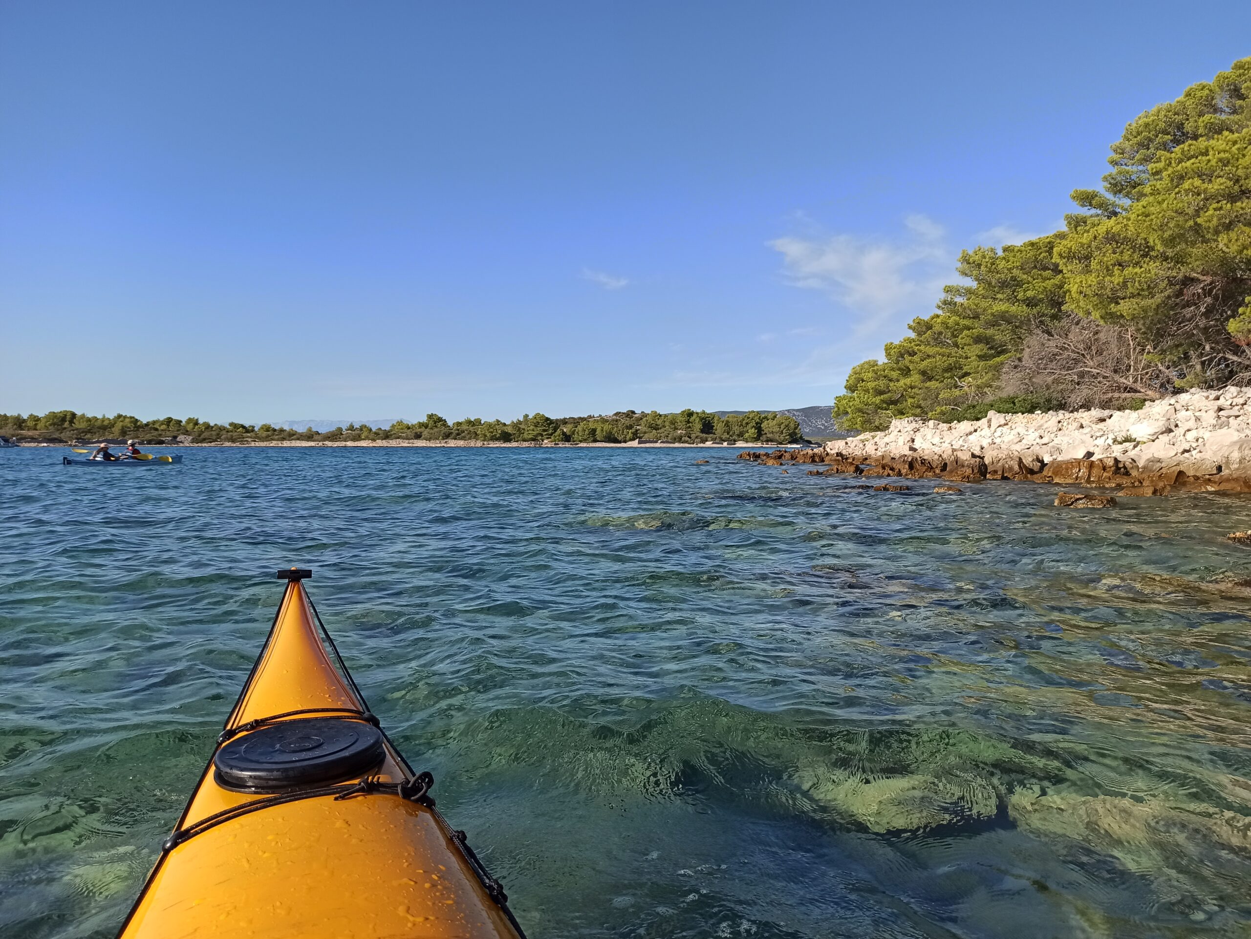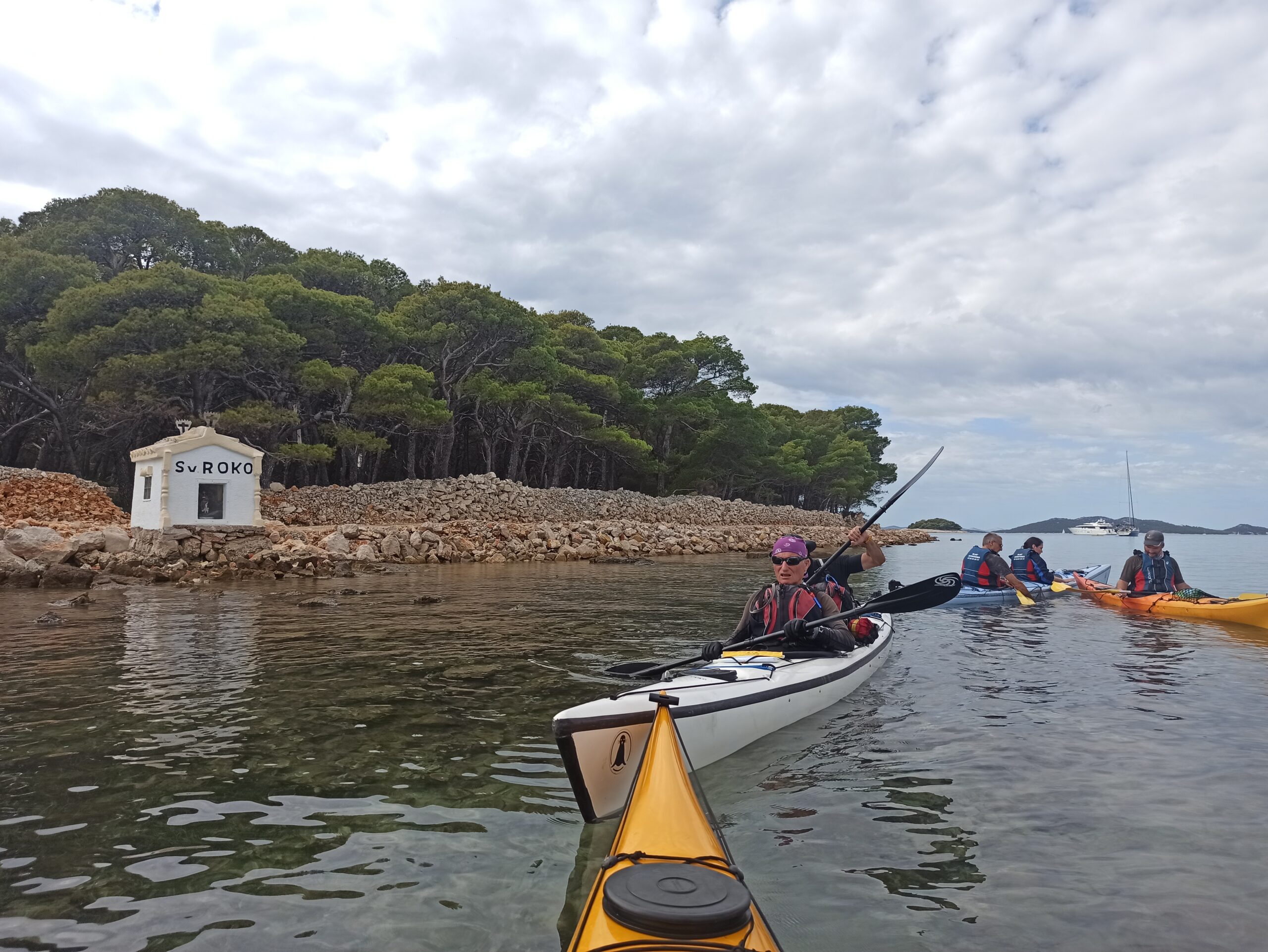 Une fois n’est pas coutume, c’est dans un camping en bord de mer que nous avons basé notre séjour. Tipi déplié, bâche montée, le camp fut bien vite monté grâce à l’expérience des pagayeurs. Et nous voilà partis pour en direction de la petite île qui abrite la minuscule chapelle Crkva Sveta Justin. Immersion directe dans la phonétique croate et dépaysement garanti !